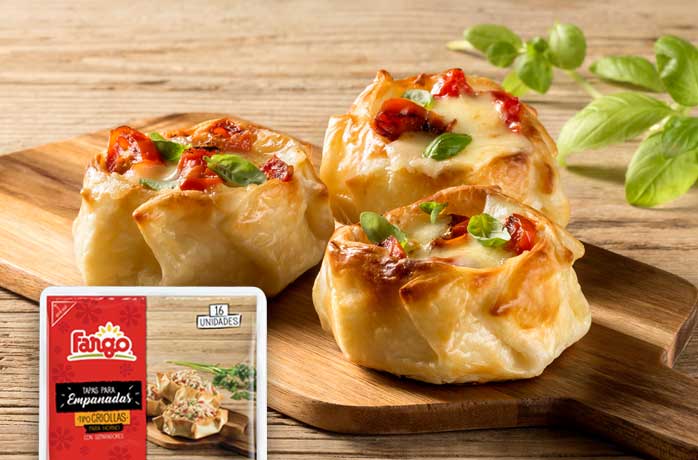 <p>Rallar o picar la muzzarella y mezclar con los tomates cherry y las hojas de albahaca. Tomar las tapas de empanada, humedecer ligeramente el contorno y hacer pequeños pliegues presionando bien y dando forma de canasta, disponer sobre una placa apta para horno aceitada.</p><p>Rellenar, pintar con huevo y cocinar en horno precalentado a 180 grados hasta dorar.</p>